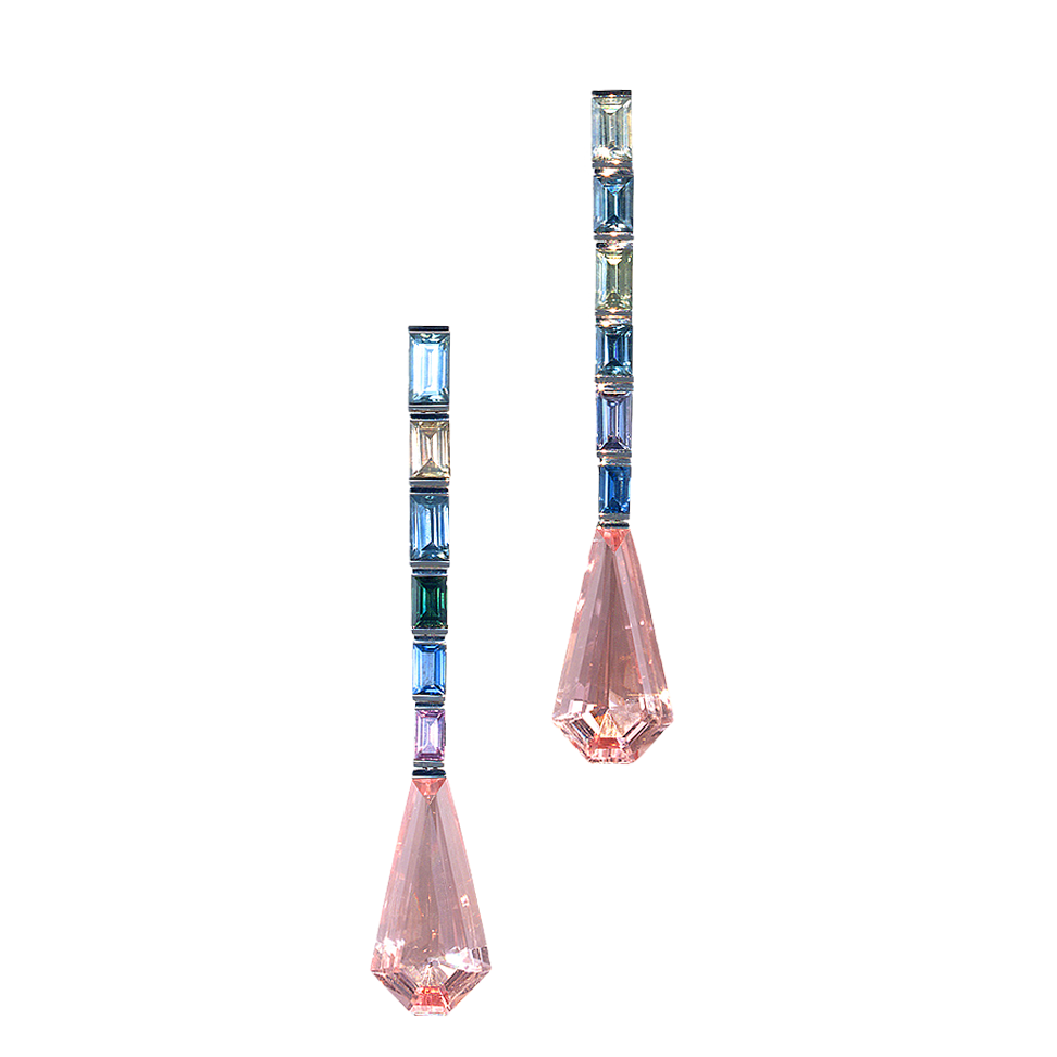 Ohrringe mit facettierten pastellfarbenen Morganiten und baguetteförmig geschliffenen Montana-Saphiren, in Platin gefasst. Maßanfertigung, gezeigte Länge 7 cm.