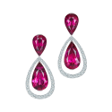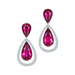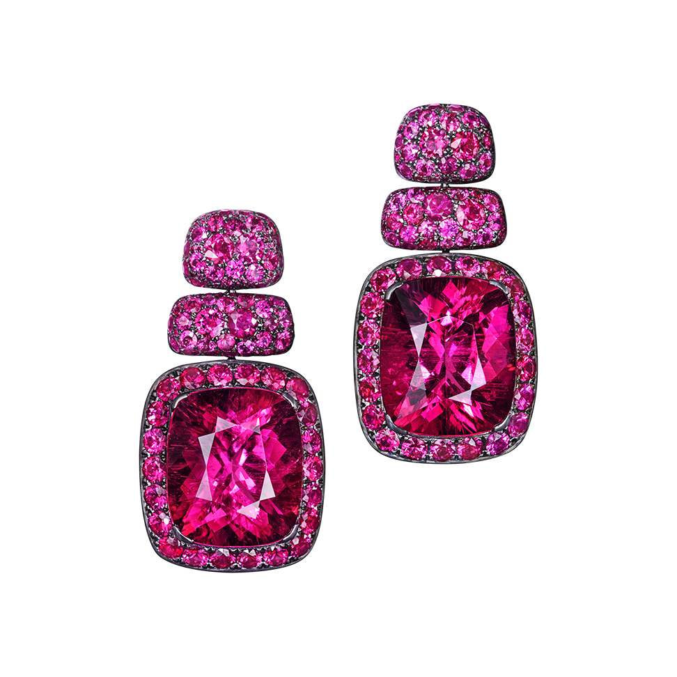 Ohrringe mit antikoval facettierten pinkfarbenen Rubelliten, Provenienz Mosambik, Rahmen und pavéegefassten Oberteilen mit pinkfarbenen Rubinen, in Silberbronze und 750/000 Weißgold gearbeitet.