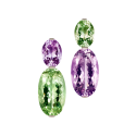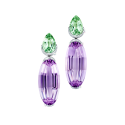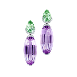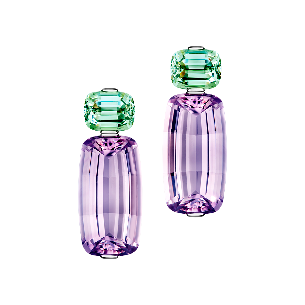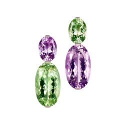 Ohrringe mit antikoval geschliffenen, brasilianischen Amethysten und Prasiolithen, in 750/000 Weißgold gefasst. Maßanfertigung, gezeigte Länge 5 cm.