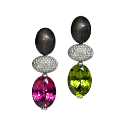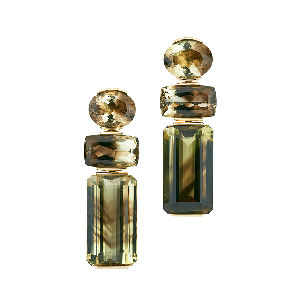 Ohrringe mit Mischkristallen aus Citrin und Rauchquarz im Smaragdschliff, Kissenschliff und Oval geschliffen, in 750/000 Gelbgold gefasst. Maßanfertigung, gezeigte Länge 5,5 cm.