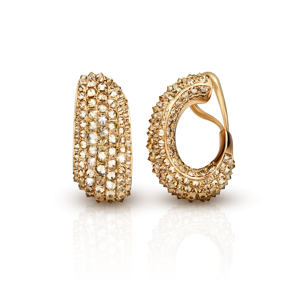 Creolen-Ohrringe, mit naturbraunen Diamanten bespikt (umseitig gefasst), aus der "Symphony"-Kollektion, in 750/000 Roségold gearbeitet. Ein rechter und ein linker Ohrring garantieren den perfekten Sitz am Ohr. Maßanfertigung, gezeigte Länge 4,5 cm.