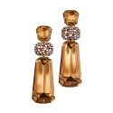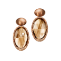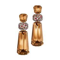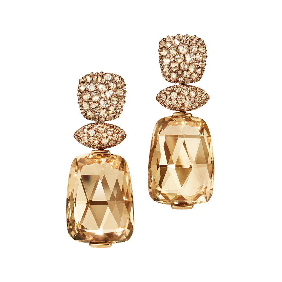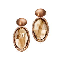 Dreiteilige Ohrringe mit trapezförmigen Rauchquarz-Briolettes sowie Navettes und Oberteilen aus braunen Diamanten, in 750/000 Roségold gefasst. Dank unsichtbarer Wechselmechaniken lassen sie sich kurz oder lang tragen und mit anderen Elementen kombinieren. Maßanfertigung, 6 cm.