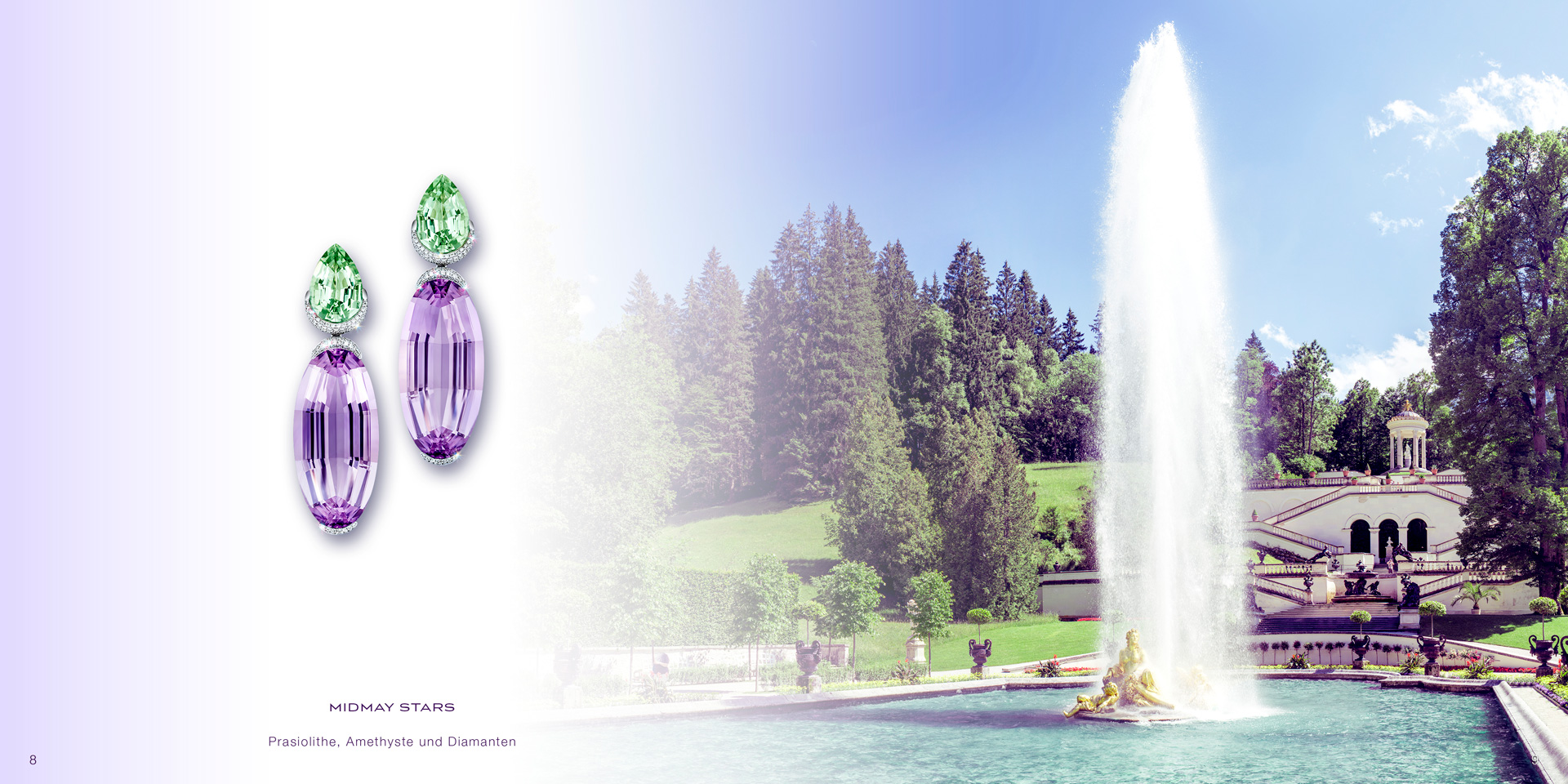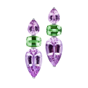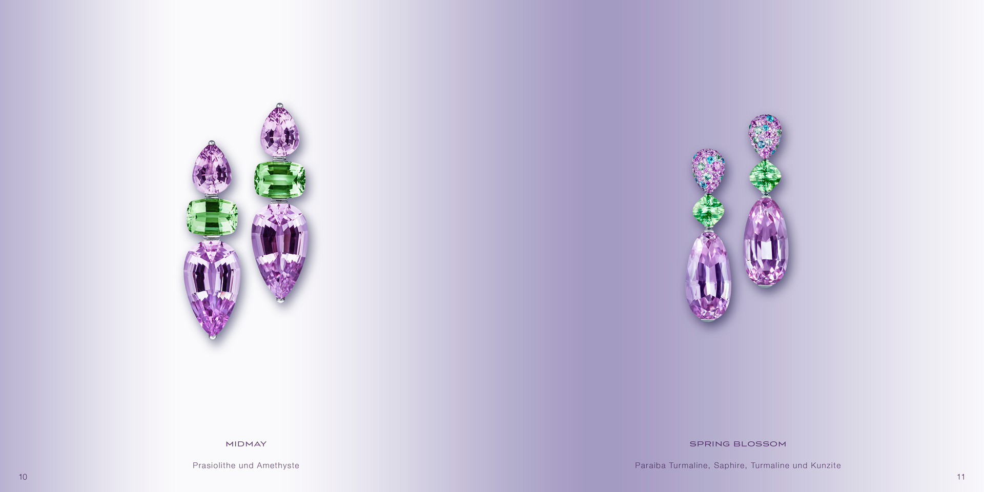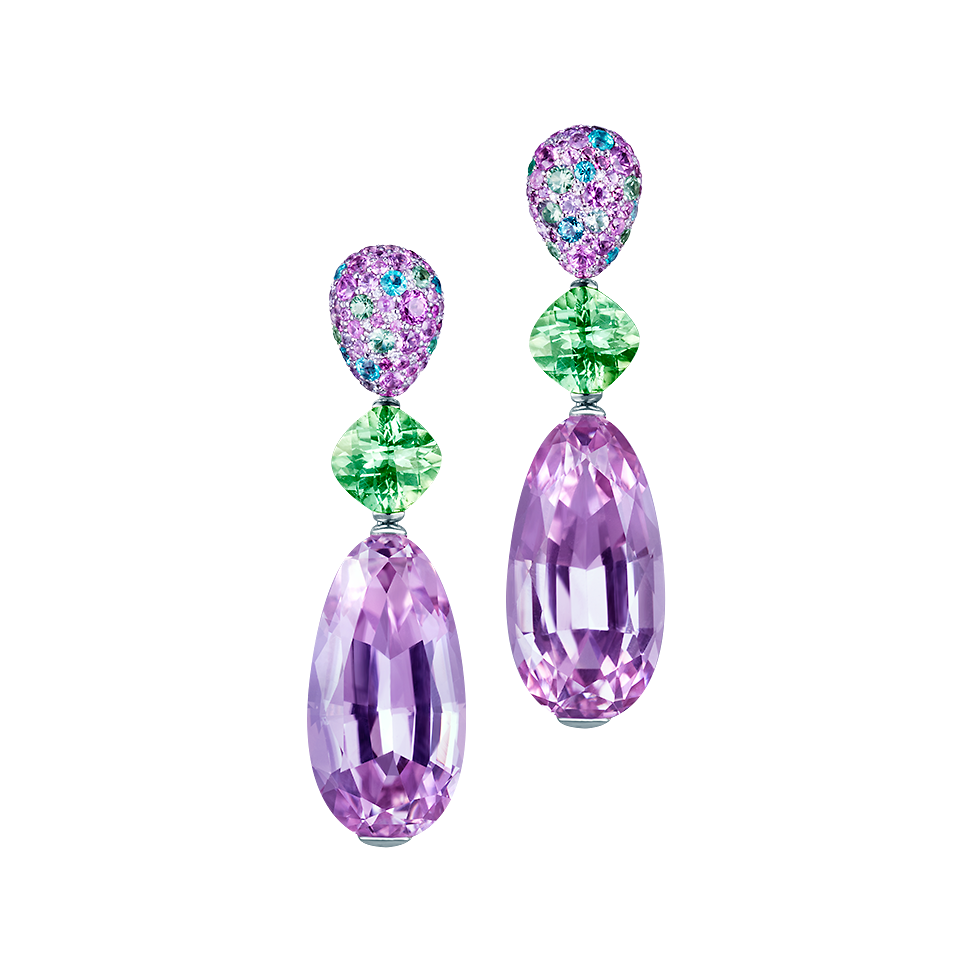 Ohrringe mit tropfenförmigen, brasilianischen Kunziten, mintfarbenen Turmalinen, Paraiba Turmalinen und Saphiren, in 750/000 Weißgold gefasst. Maßanfertigung, gezeigte Länge 6 cm.