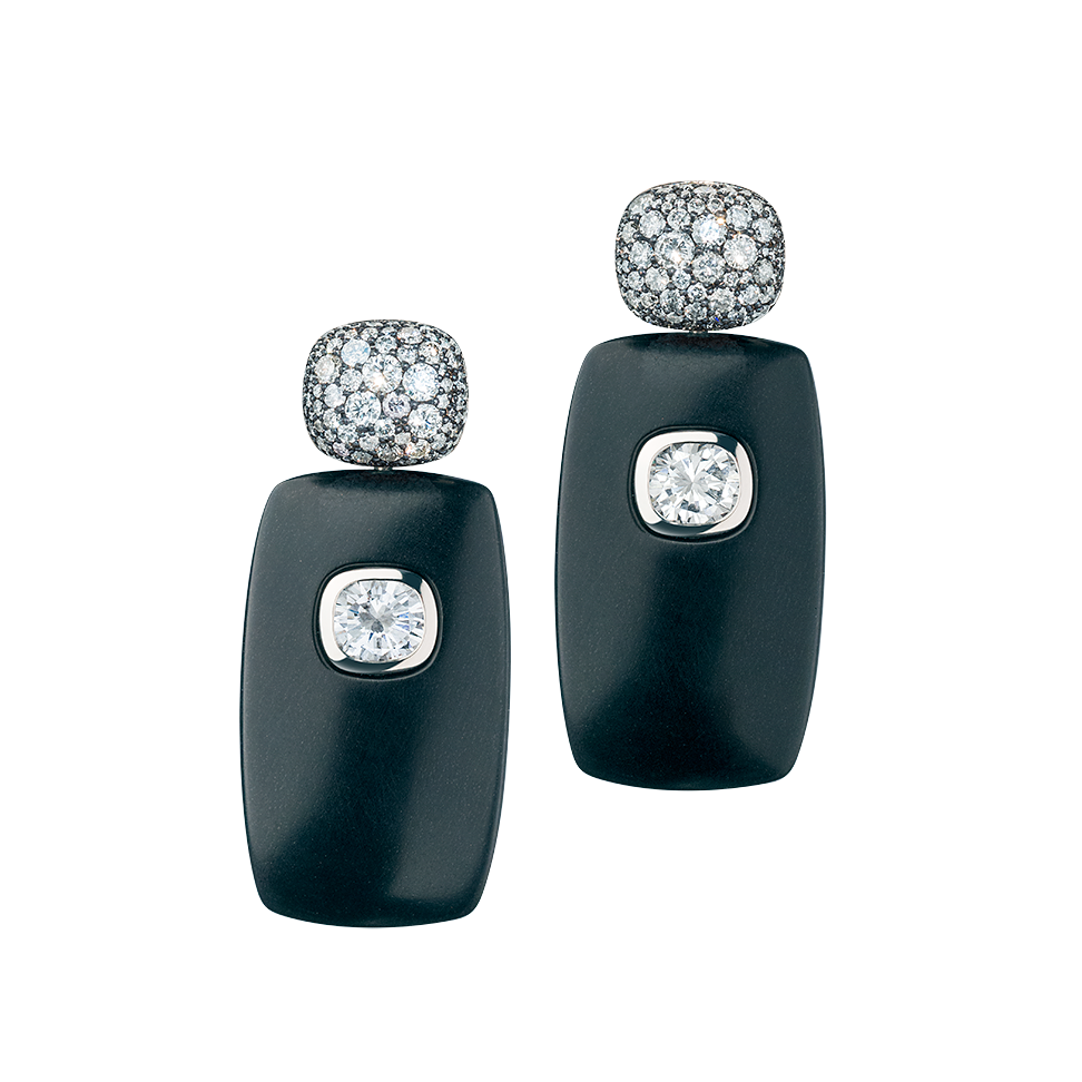 Ohrringe mit antikoval geschliffenen Diamanten, von Ebenholz umrahmt, und Oberteilen aus weißen Diamanten, in 750/000 Weißgold gefasst. Dank unsichtbarer Wechselmechaniken lassen sie sich mit anderen Elementen kombinieren. Maßanfertigung, gezeigte Länge 5,5 cm.