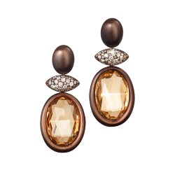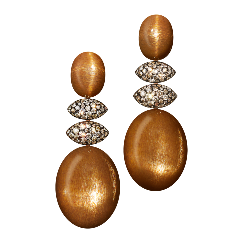 Ohrringe mit indischen Sonnenstein-Cabochons und naturfarbenen Diamanten, in Goldbronze gefasst. Maßanfertigung, gezeigte Länge 7 cm.