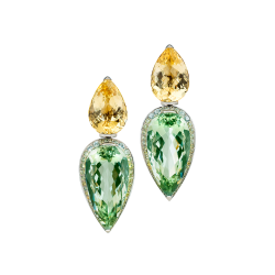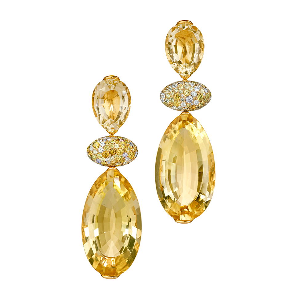 Dreiteilige Ohrringe mit sonnengelben Citrinen und Saphiren sowie weißen Diamanten, in 750/000 Gelbgold gefasst und durch unsichtbare Wechselmechaniken "Trinity Transformers" verbunden. Dadurch lassen sie sich kurz oder lang tragen und mit anderen Elementen kombinieren. Maßanfertigung, gezeigte Länge 9,5 cm.