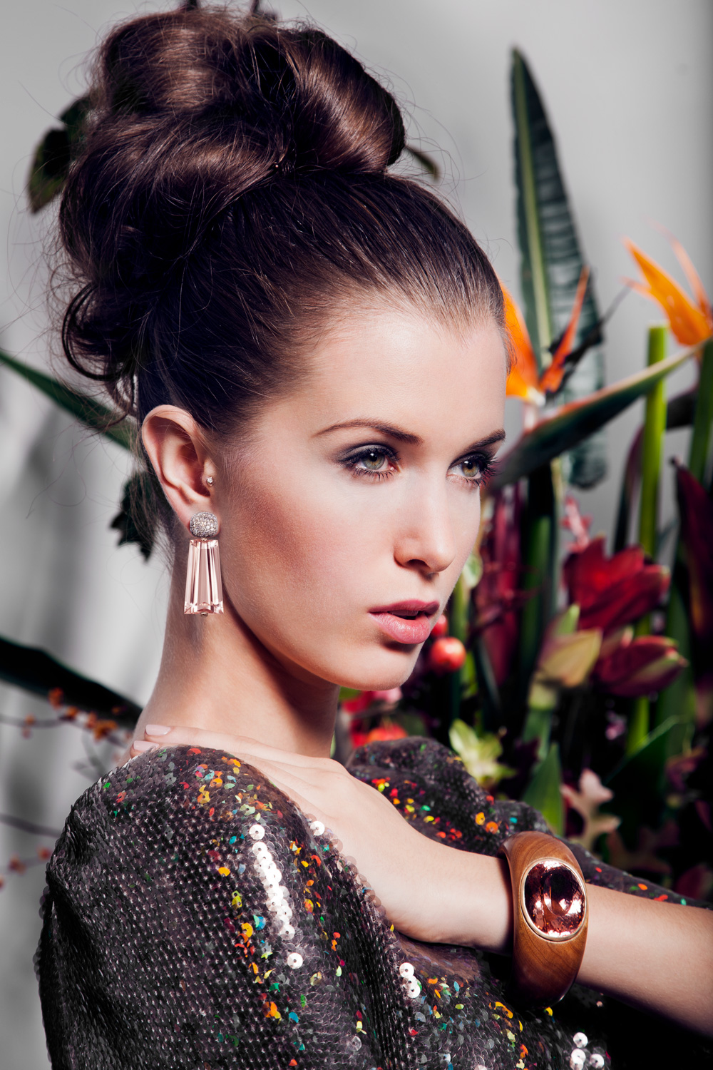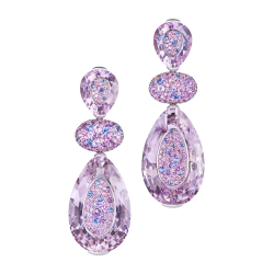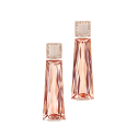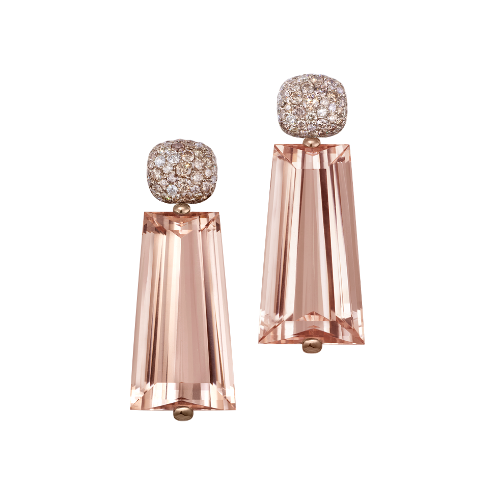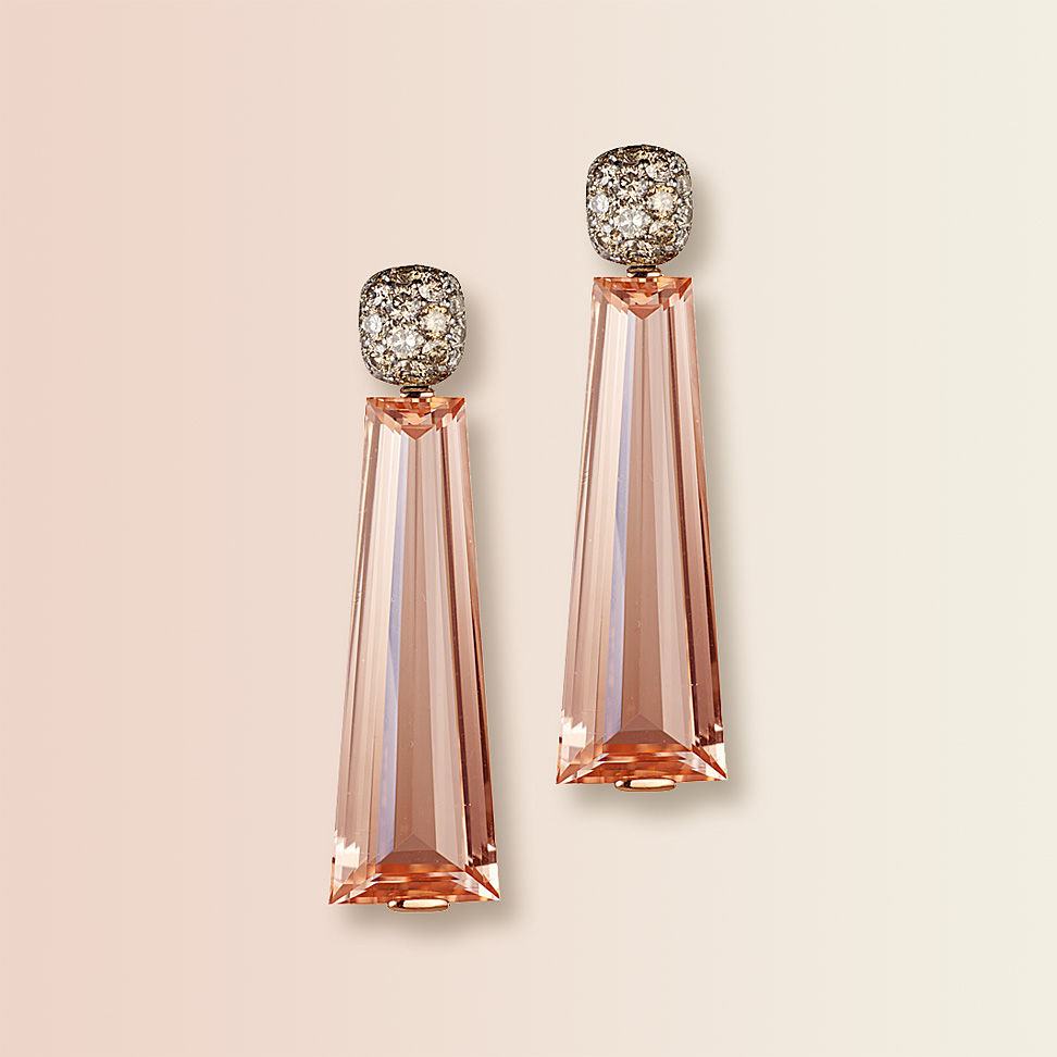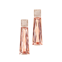 Zweiteilige Ohrringe mit trapezförmigen Morganiten und roséfarbenen Diamanten, in 750/000 Weißgold gefasst und durch eine unsichtbare Wechselmechanik verbunden. Dadurch lassen sie sich mit anderen Elementen kombinieren. Maßanfertigung, gezeigte Länge 5 cm.