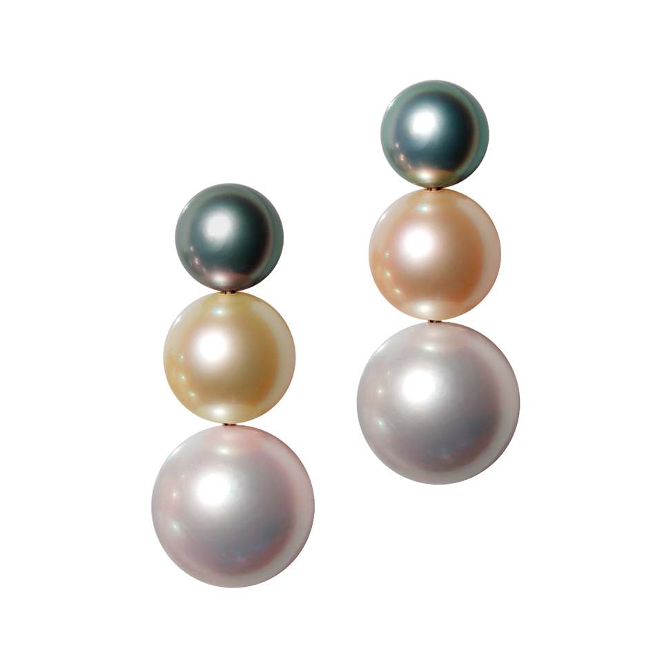 Dreiteilige Ohrringe mit weißen und goldenen Südsee-Perlen und silber-grauen Tahiti-Perlen, durch unsichtbare Wechselmechaniken "Trinity Transformers" verbunden. Dadurch lassen sie sich in verschiedenen Längen tragen. Maßanfertigung, gezeigte Länge 4 cm.