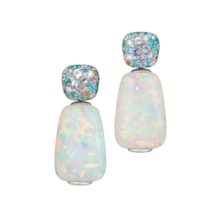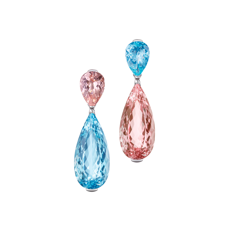 Ohrringe mit tropfenförmig geschliffenen Morganiten und Aquamarinen aus Brasilien und Afrika, in 750/000 Weißgold gefasst. Maßanfertigung, gezeigte Länge 4 cm.