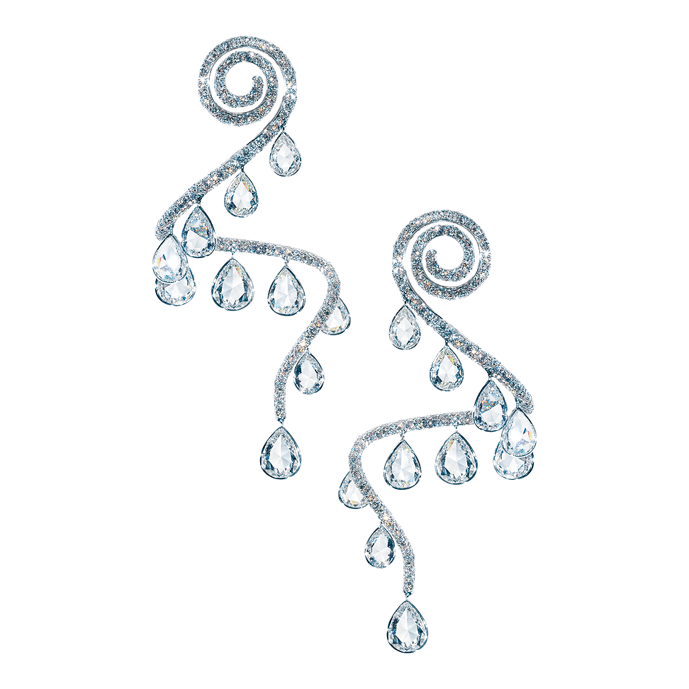 Ohrringe aus diamantbesetzten Spiralen mit Diamant-Tropfen, in 750/000 Weißgold gefasst. Maßanfertigung, gezeigte Länge 6 cm.