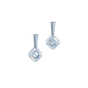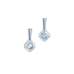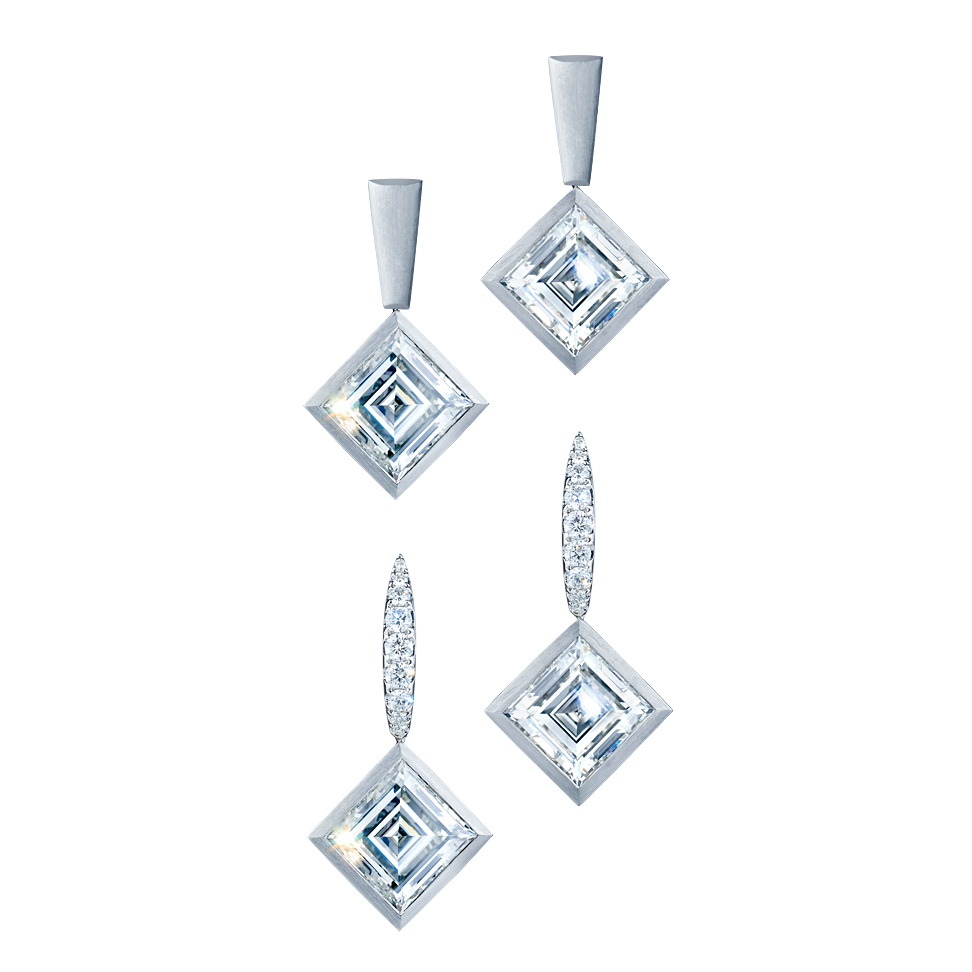 Ohrringe mit Diamanten im Carréeschliff, in Platin gefasst. Durch unsichtbare Wechselmechaniken lassen sich die Oberteile variieren. Maßanfertigung, gezeigte Länge 2 cm.