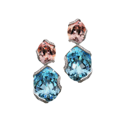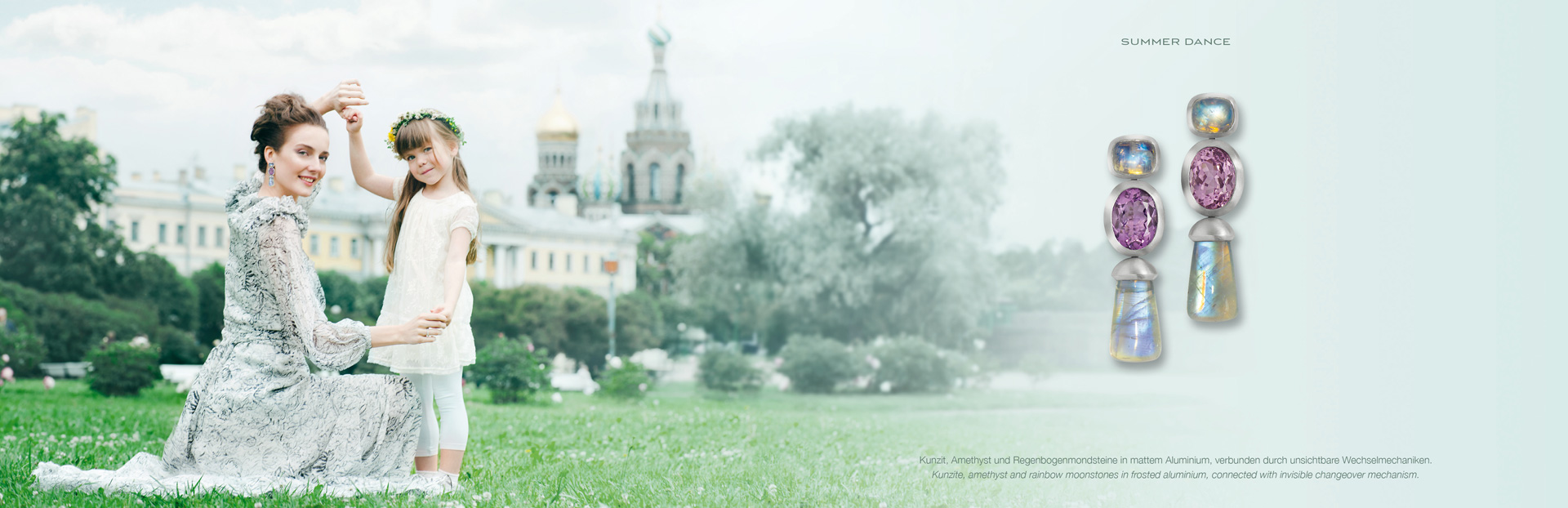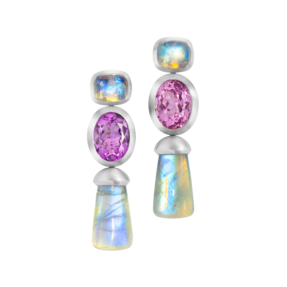 Ohrringe mit quastenförmigen und antikovalen Regenbogen-Mondsteinen sowie oval facettiertem Kunzit und Amethyst, in Aluminium gefasst. Maßanferigung, gezeigte Länge 4,5 cm.