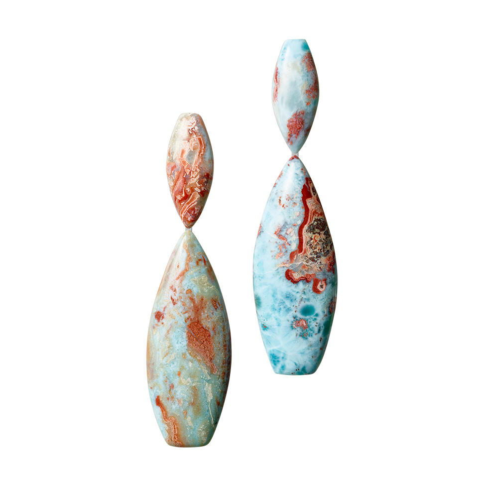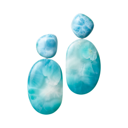 Ohrringe aus Larimar, geshaped wie Surfboards und mit weiteren Edelsteinen individualisierbar. Dank unsichtbarer Wechselmechaniken lassen sich die Oberteile einzeln tragen oder mit anderen Anhängern kombinieren. Maßanfertigung