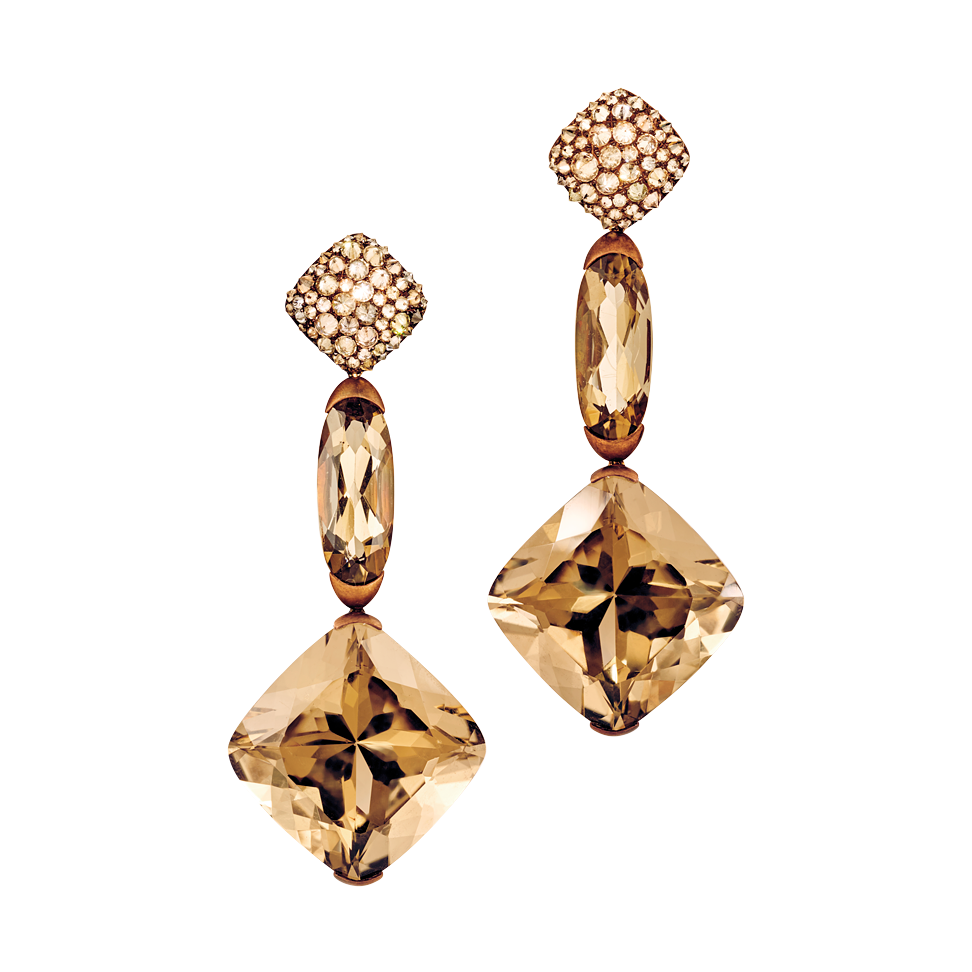 Ohrringe mit kissenförmigen und ovalen goldfarbenen Rauchquarzen, die frei schwebend an mit naturfarbenen Diamanten ausgefassten Oberteilen hängen und in Goldbronze gefasst sind. Mechaniken und Rückseiten in 750/000 Roségold. Durch eine unsichtbare Wechselmechanik lassen sie sich kurz oder lang tragen. Maßanfertigung, gezeigte Länge 7 cm.