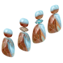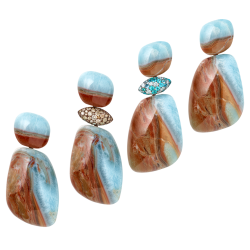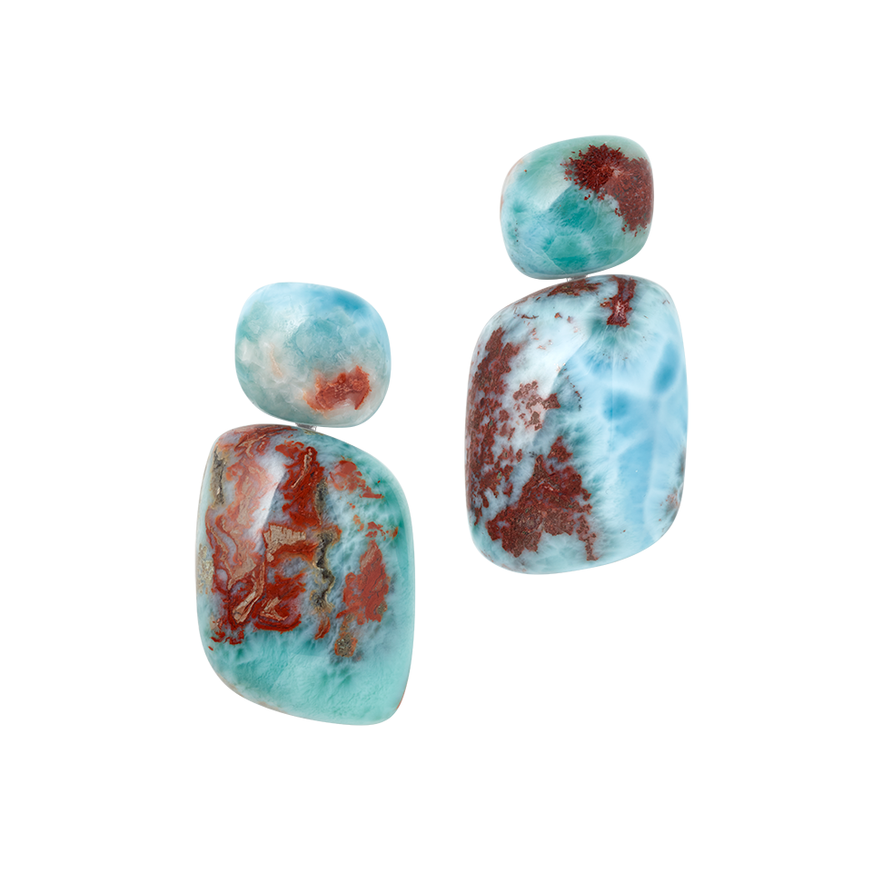 Die sprudelnde Energie, die frei wird, wenn das Meer auf schroffe Klippen prallt, versprühen die Ohrringe „Reef“. In leicht angeschrägter Form rahmt dieser natürlich gewachsene Larimar die Gesichtskonturen seiner Trägerin schmeichelnd und energetisierend zugleich.