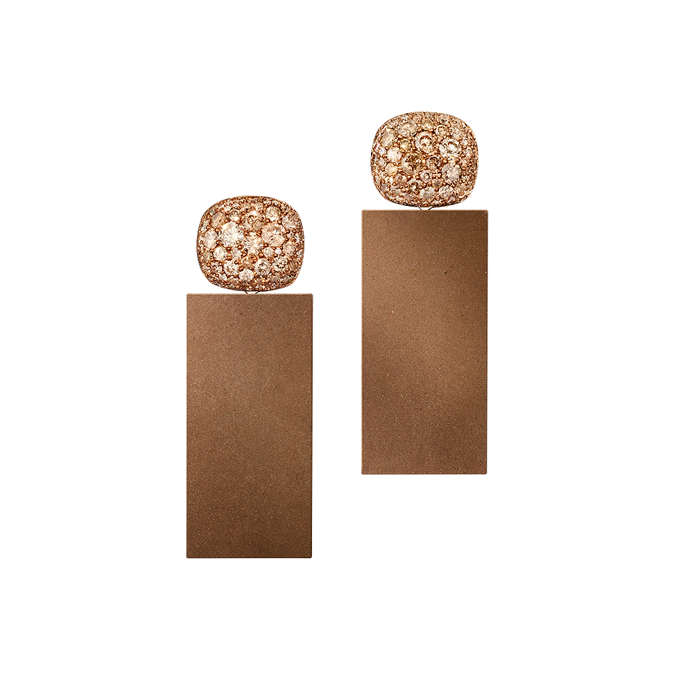 Ohrringe aus deutschem Schiefer, zu puristischen Rechtecken geschliffen, und mit naturbraunen Diamanten besetzten Oberteilen, in 750/000 Weißgold gefasst. Maßanfertigung, gezeigte Länge 4,5 cm.