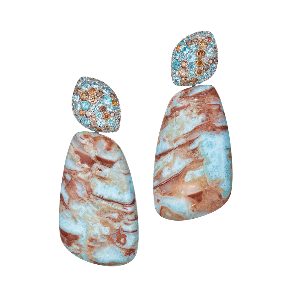 Die feinen Schattierungen des Larimar in Erdtönen und Ozeanblau spiegeln sich funkelnd in den Oberteilen und intensivieren das lebhafte Farbspiel der Ohrgeschmeide. Mit ihrer abgeschrägten Form folgen sie den Gesichtszügen ihrer Trägerin