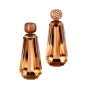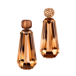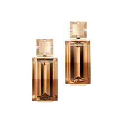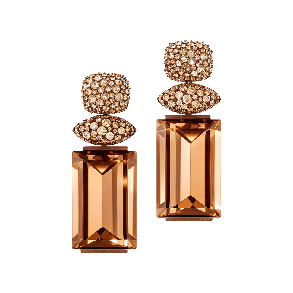 Ohrringe mit architektonisch geschliffenen goldbraunen Rauchquarzen sowie Bauhaus-Körpern mit naturfarbenen Diamanten besetzt, in Goldbronze gefasst. Maßanfertigung, gezeigte Länge 6,5 cm.