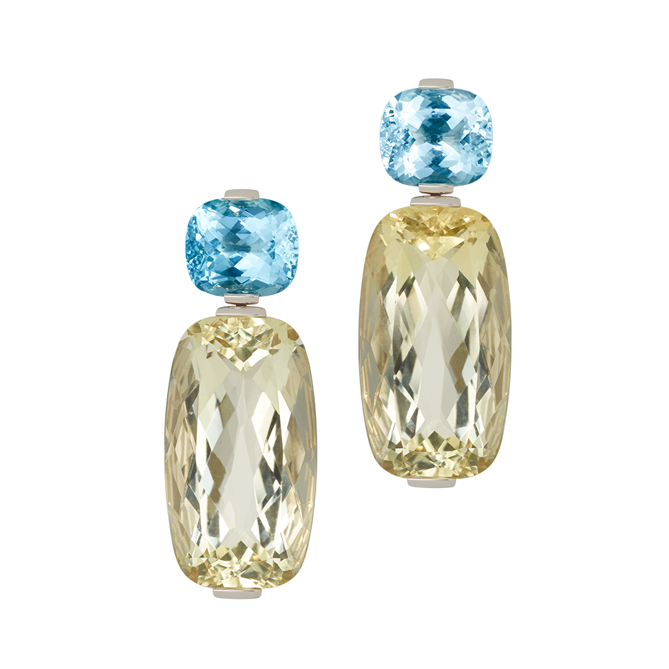 Zweiteilige Ohrringe mit facettierten Topas-Oberteilen sowie Citrin-Anhängern, in 750/000 Weißgold gefasst. Maßanfertigung, gezeigte Länge 5 cm.