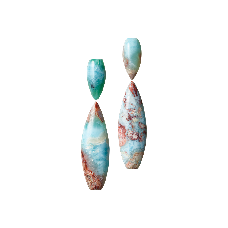 Ohrringe aus Larimar, geshaped wie Surfboards und mit weiteren Edelsteinen individualisierbar. Dank unsichtbarer Wechselmechaniken lassen sich die Oberteile einzeln tragen oder mit anderen Anhängern kombinieren. Maßanfertigung