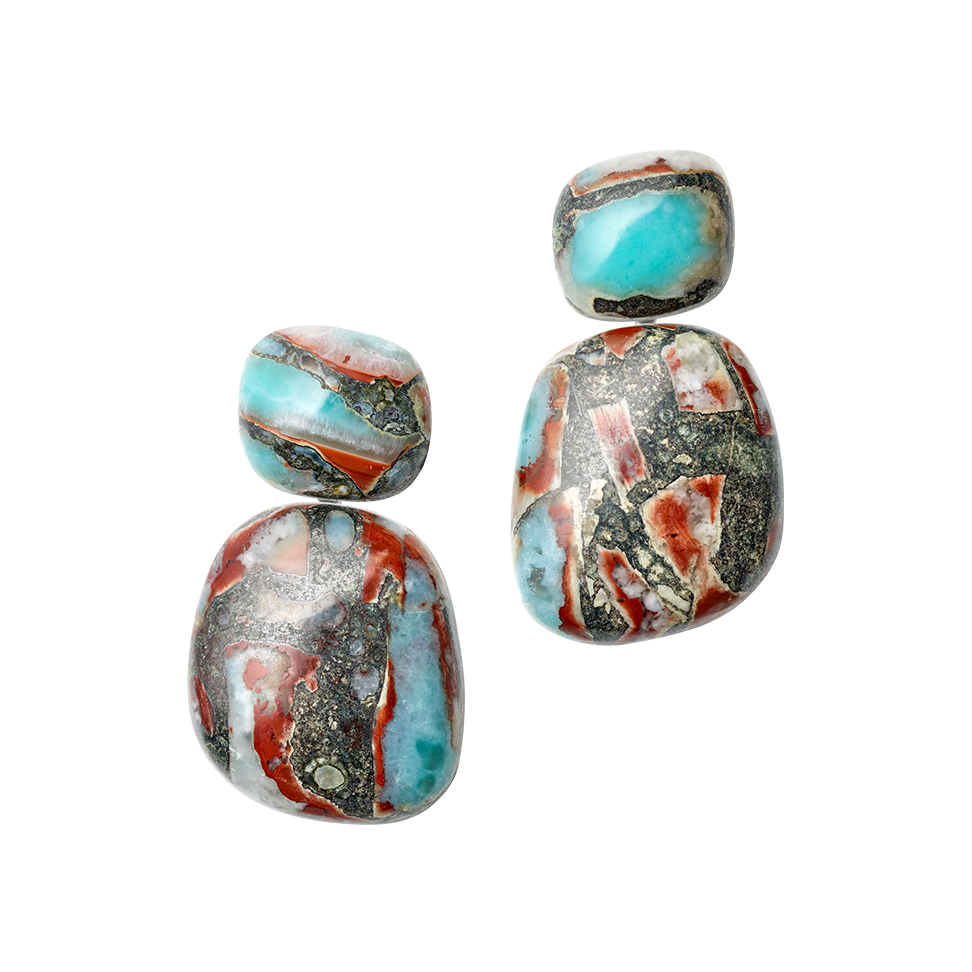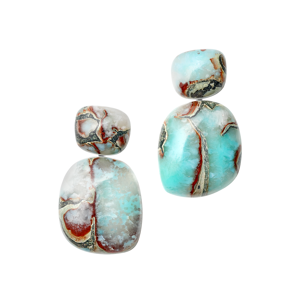 Die natürlich gewachsenen Farbmomente des Larimar zeigen die Wandelbarkeit des Meeres. Neontürkis wie leuchtende Lagunen, rotbraun wie Korallenbänke und tiefgrau wie vulkanische Riffs – die Ohrringe „Underwater“ offenbaren einen Einblick in verborgene Unterwasser-Welten.