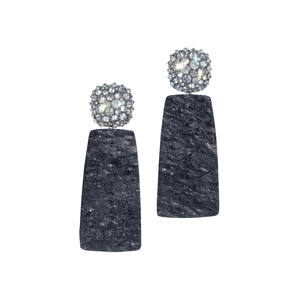 Ohrringe aus gebrochenen Schiefer-Platten und mit grauen Diamanten bespikten Oberteilen, in 750/000 Weißgold gefasst. Maßanfertigung, gezeigte Länge 4,5 cm.