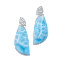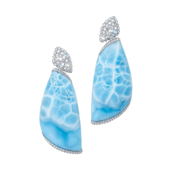 Inspiriert von den natürlichen Strukturen des Larimar, sind die Ohrringe „Winter Magic“ mit einem abstrakten Mosaik aus Paraiba-Turmalinen, Saphiren und Diamanten intarsiert. Sie folgen den Gesichtskonturen ihrer Trägerin und rahmen es schmeichelnd. Dank der unsichtbaren Wechselmechaniken „Trinity Transformers“ lassen sich die Anhänger variieren oder beidseitig tragen.