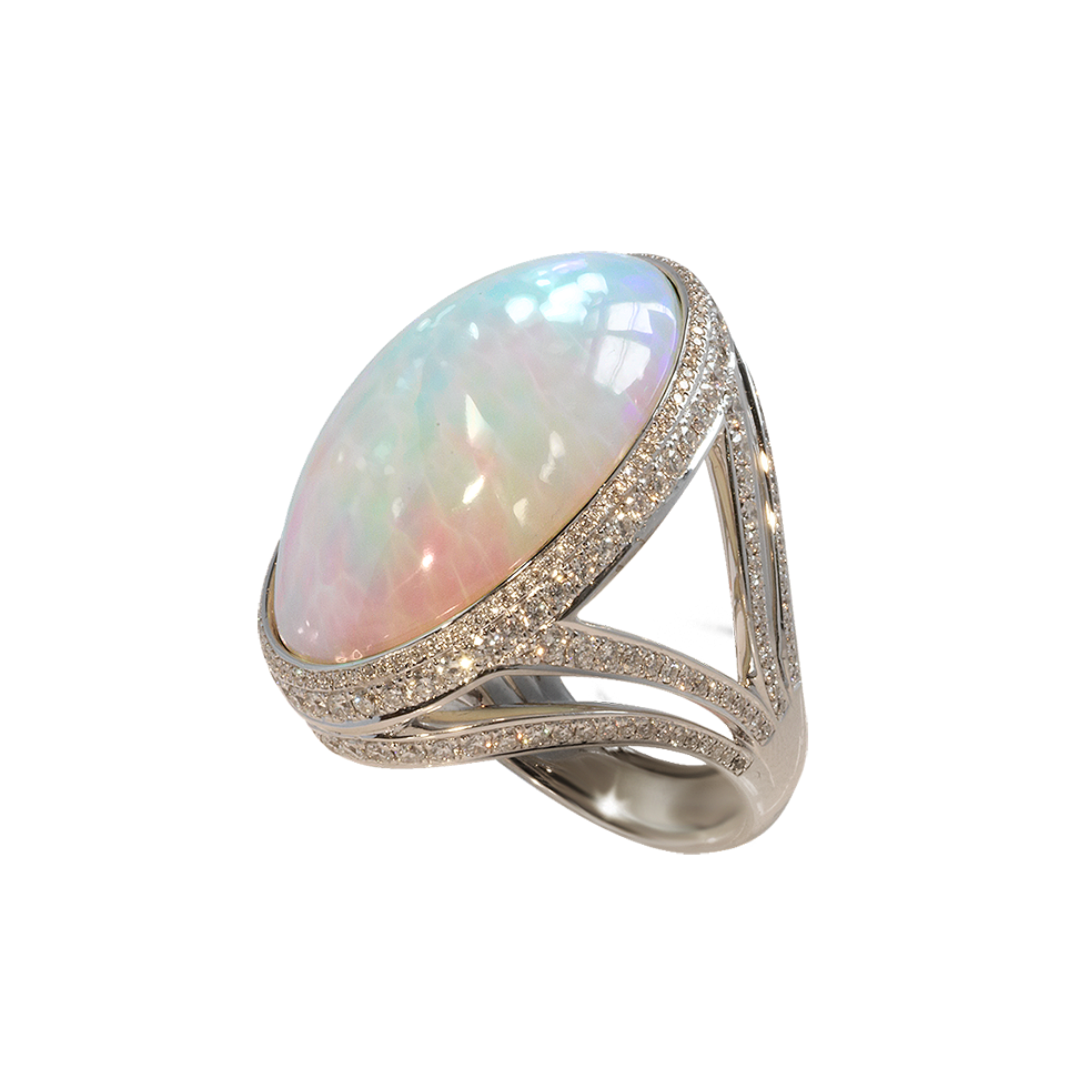 Ring mit afrikanischem Welo-Opal-Cabochon von 25,75 ct. und feinen weißen Diamanten, in 750/000 Weißgold gefasst.