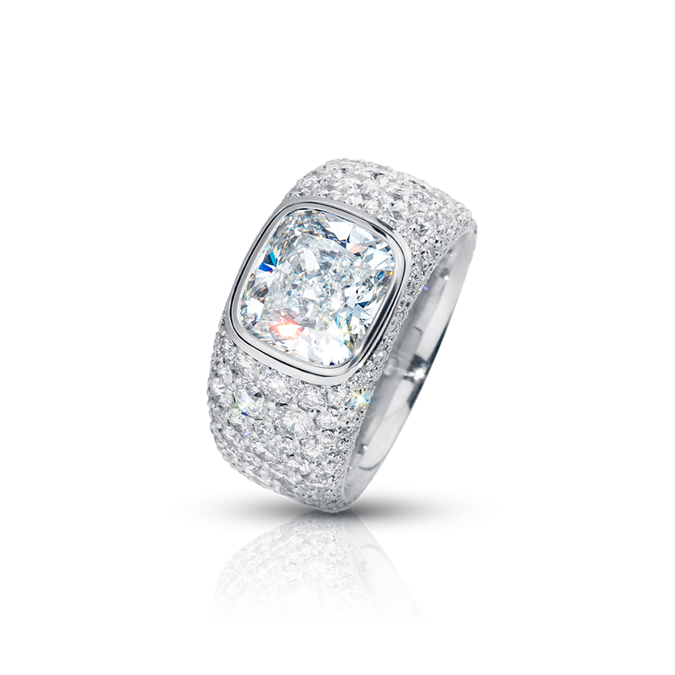 Ring mit facettiertem weißem Diamanten von 2,4 ct. im Cushion Cut, in weiße Diamanten gebettet und in 750/000 Weißgold gefasst.