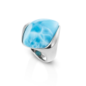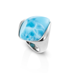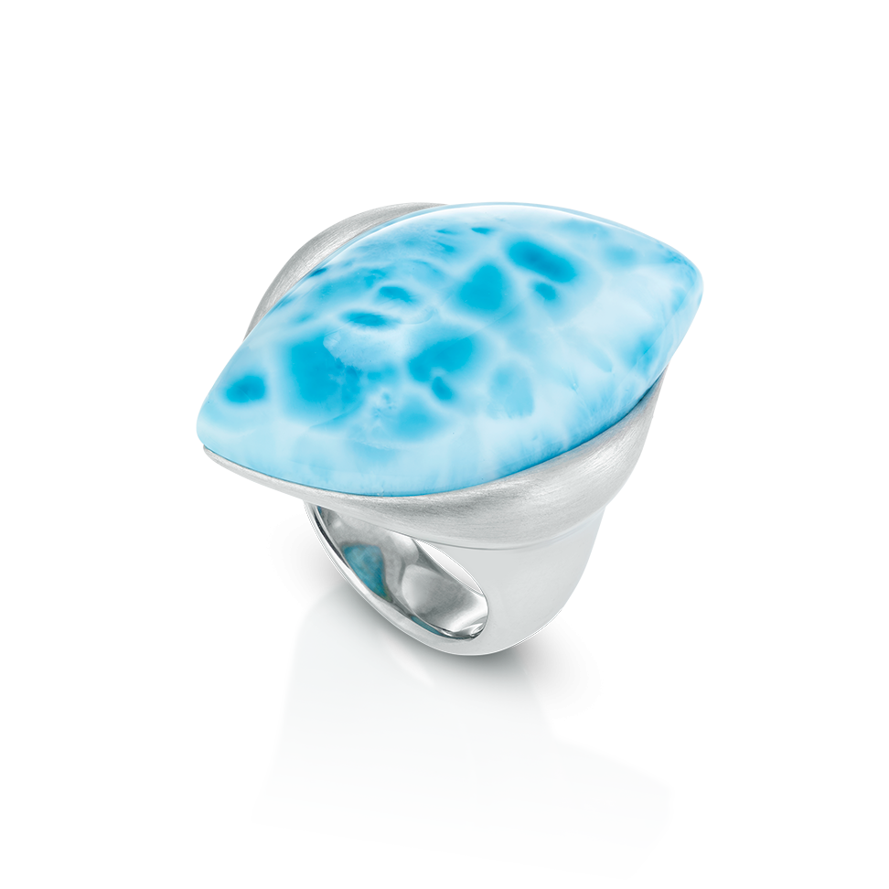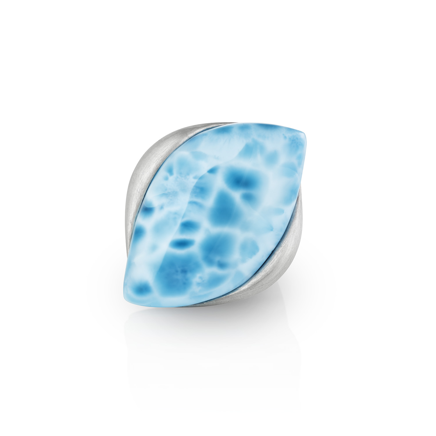 Ring mit einem wellenförmig geschliffenem Larimar-Cabochon von 45,3 ct., durchzogen von Rinons und in mattiertes 750/000 Weißgold gefasst.