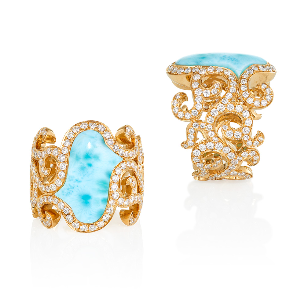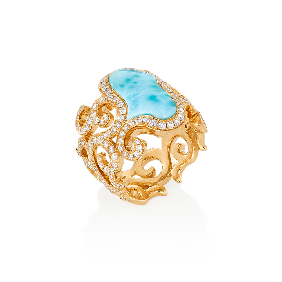 Der Reiz des Rings „Larimar Tendril“ liegt in seiner verspielten Form. Ein frei geschliffener Larimar gleich einer blauen Lagune liegt in einem Rankwerk aus weißen Diamanten in Roségold.