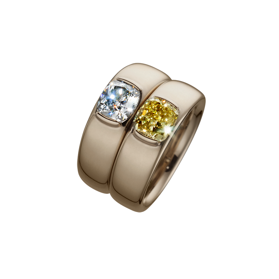 Ringpaar mit weißem Diamanten von 1,29 ct. und gelbem Diamanten von 1 ct., in 750/000 Cremegold gefasst.