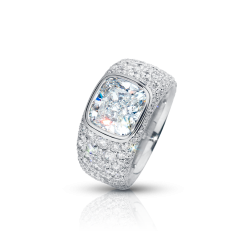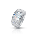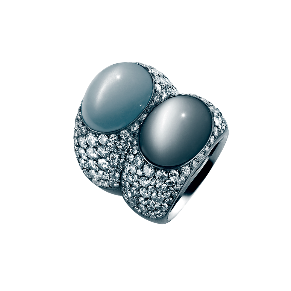 Ringpaar mit Mondstein-Cabochons und Diamanten in Grautönen, in Silberbronze gefasst und innen mit 750/000 Weißgold ausgekleidet.