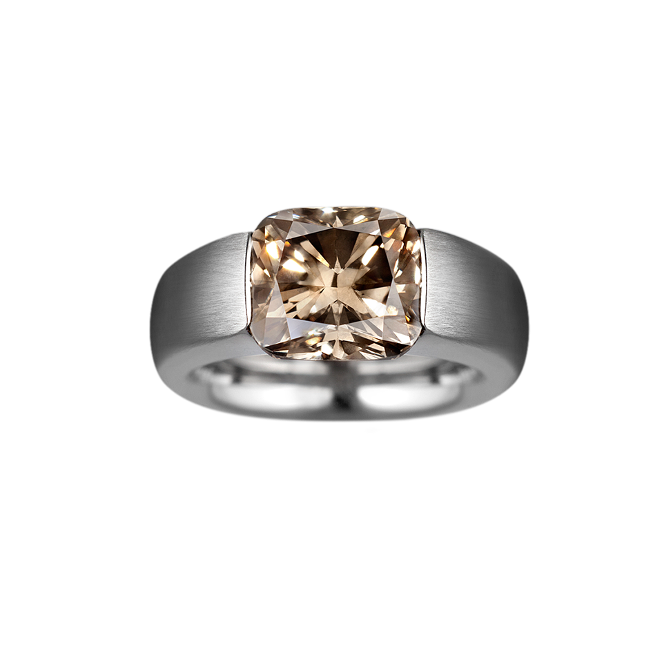 Ring mit naturbraunem Diamanten von 6,41 ct. im Cushion Cut, in mattiertes Platin gefasst.