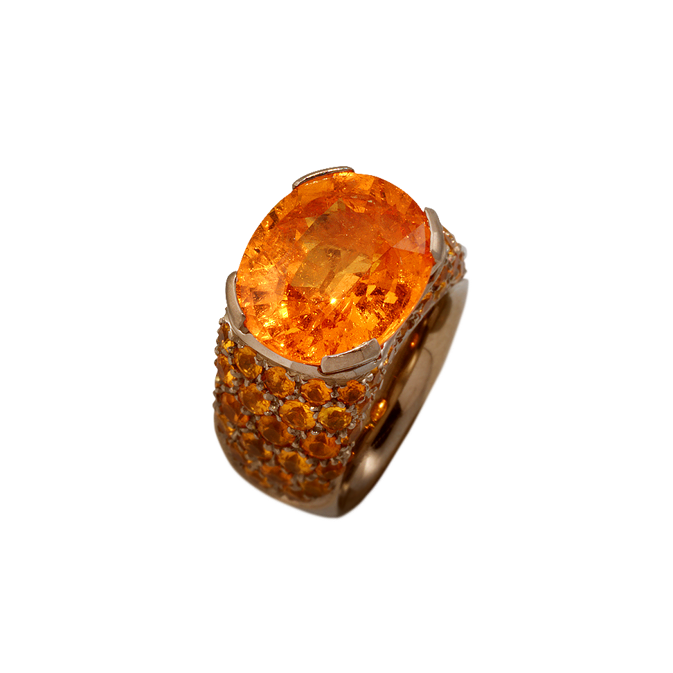 Ring mit oval facettiertem Madagaskar-Mandarin-Granat von 11 ct., gebettet in Mandarin-Granate, in 750/000 Weißgold gefasst.