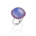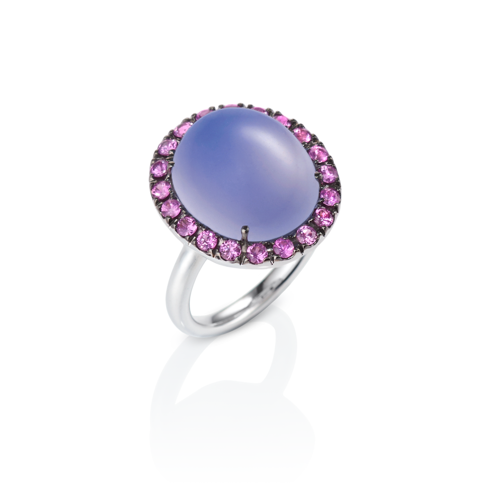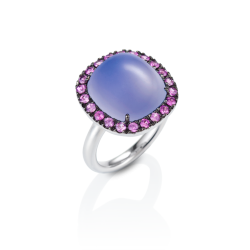 Ring mit Chalcedon-Cabochon von 10 ct., von pinken Saphiren gerahmt, in schwarz rhodiniertes 750/000 Weißgold gefasst und von 750/000 Weißgold getragen.