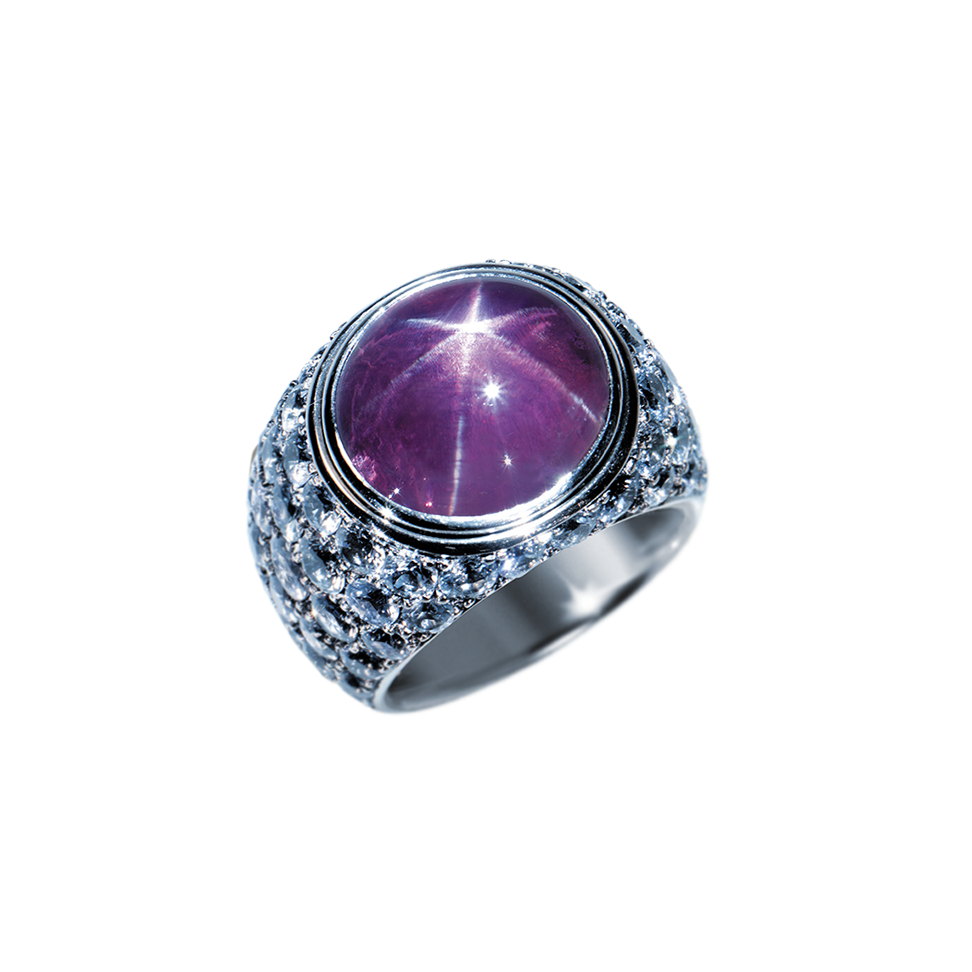 Ring mit Sternrubin-Cabochon von 12 ct., gebettet in silberblaue Sri Lanka-Saphire und in 750/000 Weißgold gefasst.