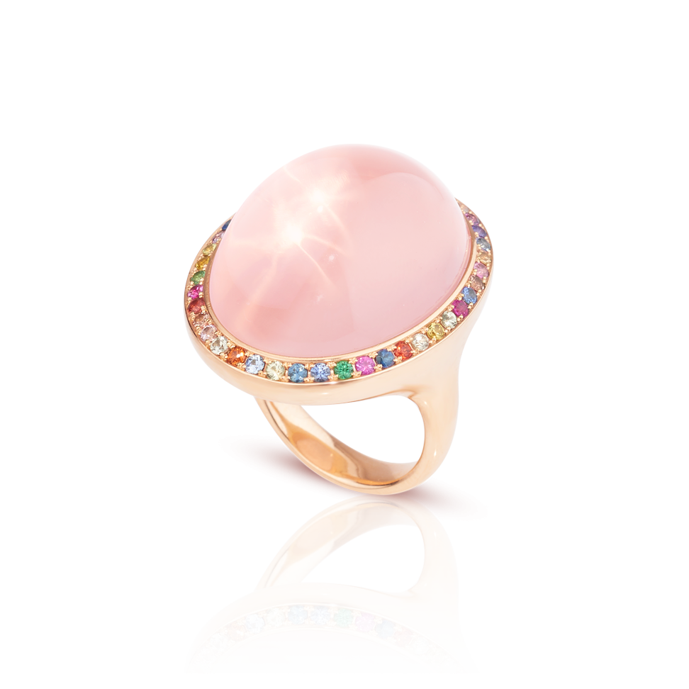 Ring mit Sternrosenquarz-Cabochon von 18 ct. und Saphiren im Farbverlauf, in 750/000 Roségold gefasst.