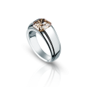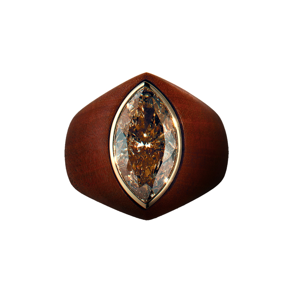 Ring mit naturbraunem Diamanten im Navette-Schliff, in 750/000 Roségold gefasst und von Pink Ivory-Edelholz ummantelt.