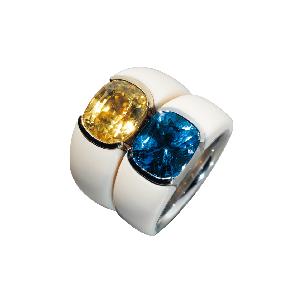 Ringpaar mit gelbem und blauem Sri Lanka-Saphir von je 5,5 ct., von Mammutbein ummantelt und in 750/000 Gelbgold bzw. Platin gefasst.